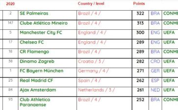 Unda etakchi sifatida 322 ochko bilan Braziliyaning “Palmeyras” jamoasi ko'rsatildi. Keyingi o'rinlardan esa “Atletiko Mineyro” hamda “Man Siti” joy oldi....